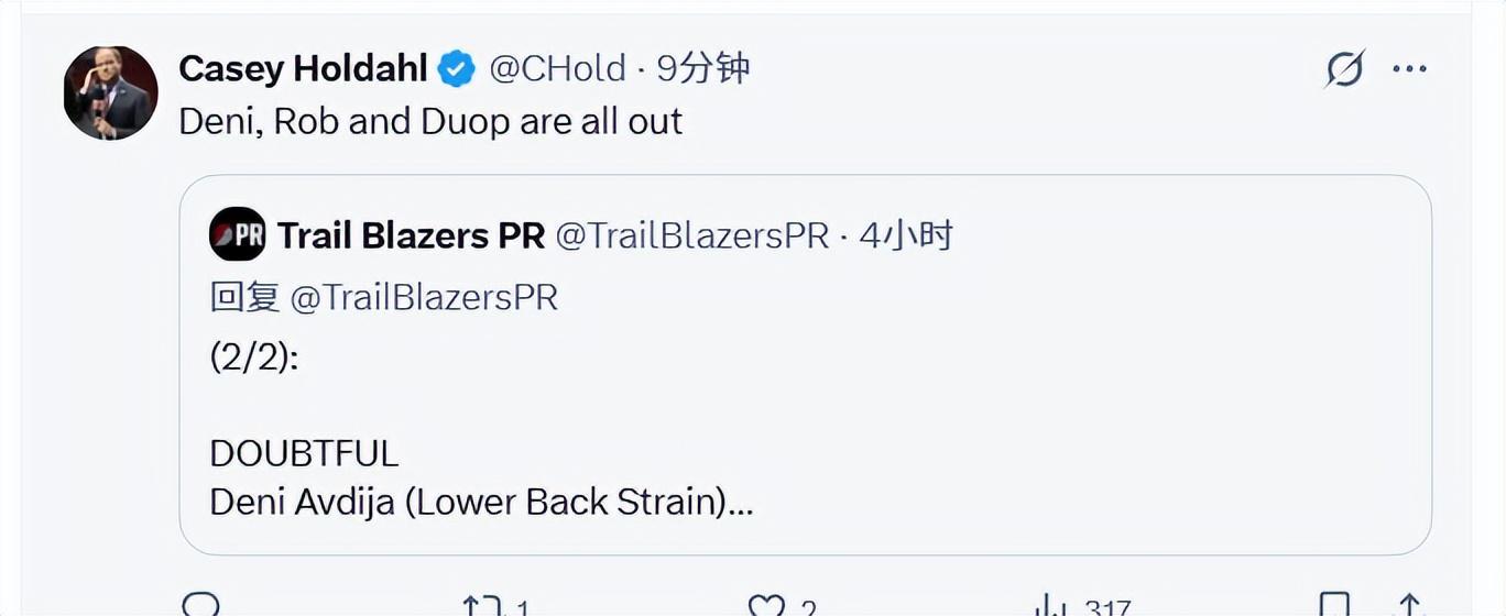 北京时间1月24日,开拓者对阵猛龙,赛前,开拓者官方更新伤病报告,阿夫迪亚、里斯和罗威都将缺席本场比赛。早先,阿夫迪亚被列为小概率出战,里斯和罗威被列为出战成疑,如今三人都将不会参加今天这场比赛。